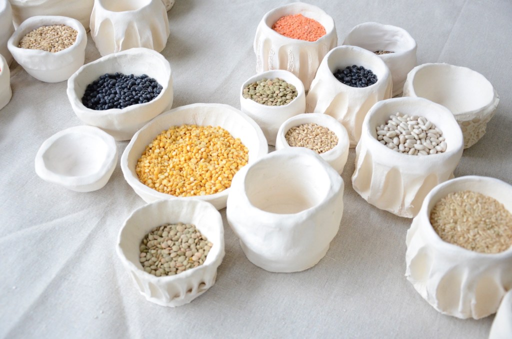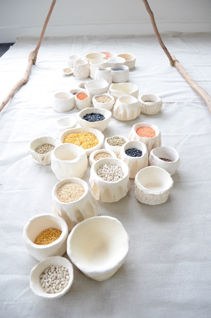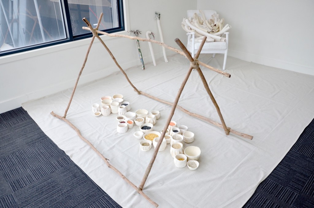 The symbolism of the ‘tent’ (wooden branches that connect over the vessels) triangle may take on many concepts; I developed the form Maslow’s Hierarchy of Needs and the ‘futures triangle’. The ‘futures triangle’ connects back to humanity and existence on a whole, at each point lies the past, present and future. The future is created in the present; but sometimes the present succumbs to habit and so the future evolves from the past. I connected the ‘tent’ frame to an idea of home, not necessarily a house, but the feeling of home, comfort and belonging. Tents symbolize protection, but often only temporary. The vessels represent abundance of resources that the world has and how they are continuing to grow and develop. This refers to how each grain symbolizes a human, and the vessels collectively symbolize the earth. As each human lives, grows, experiences and develops they create an impact in the world. This circles back to abundance; there is so much in the world, why can’t we share it? (2016)